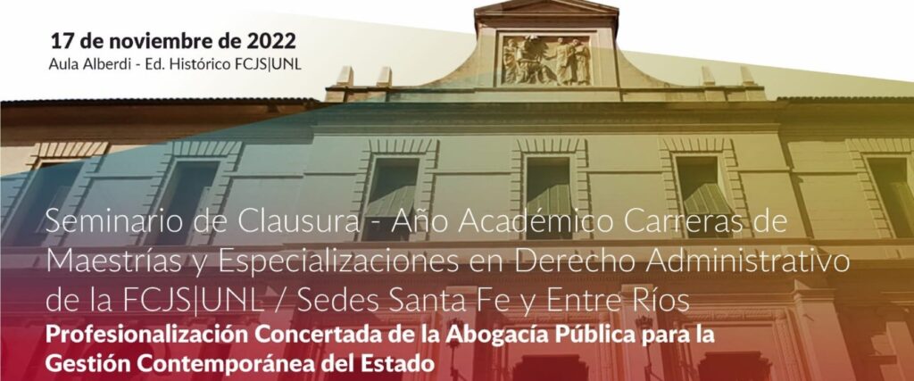El 17 de noviembre se realizará un seminario de clausura del año académico de las Carreras de Especializaciones y Maestrías en Derecho Administrativo de la Facultad de Ciencias Jurídicas y Sociales (FCJS(, de la Universidad Nacional del Litoral, UNL, Sedes Santa Fe y Entre Ríos.